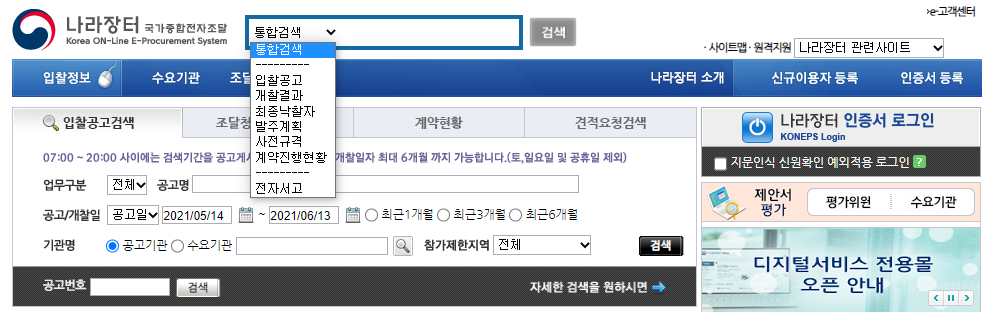 먼저 검색창에 통합검색 창에 사업명이나 발주기관명, 또는 찾고자 하는 다양한 키워드로 검색할 수 있습니다.