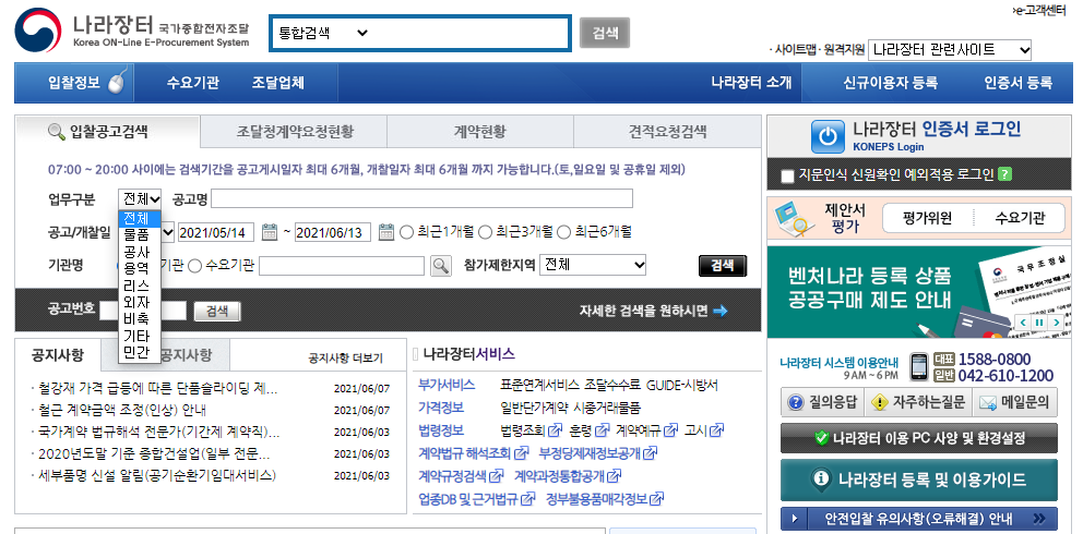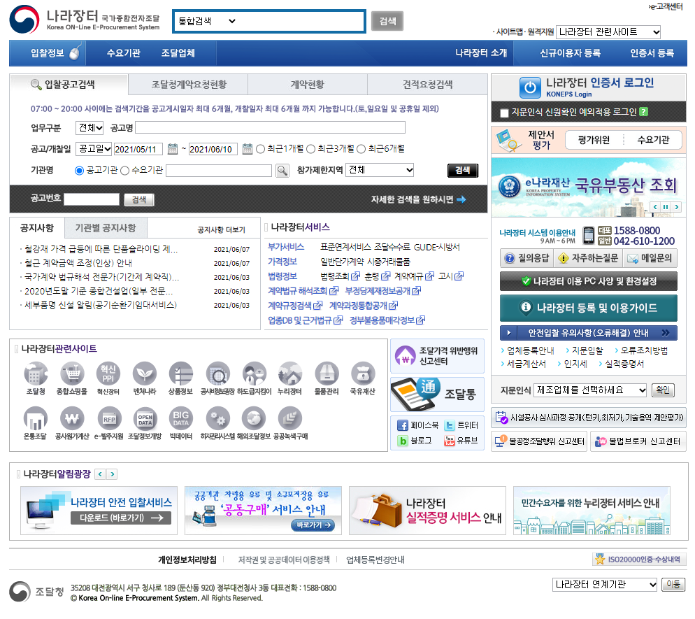 이곳에서 모든 공고익관의 발주정보도 확인 할 수 있고, 조달업무 거의 모든 과정을 전자적으로 온라인에서 처리가 가능합니다.