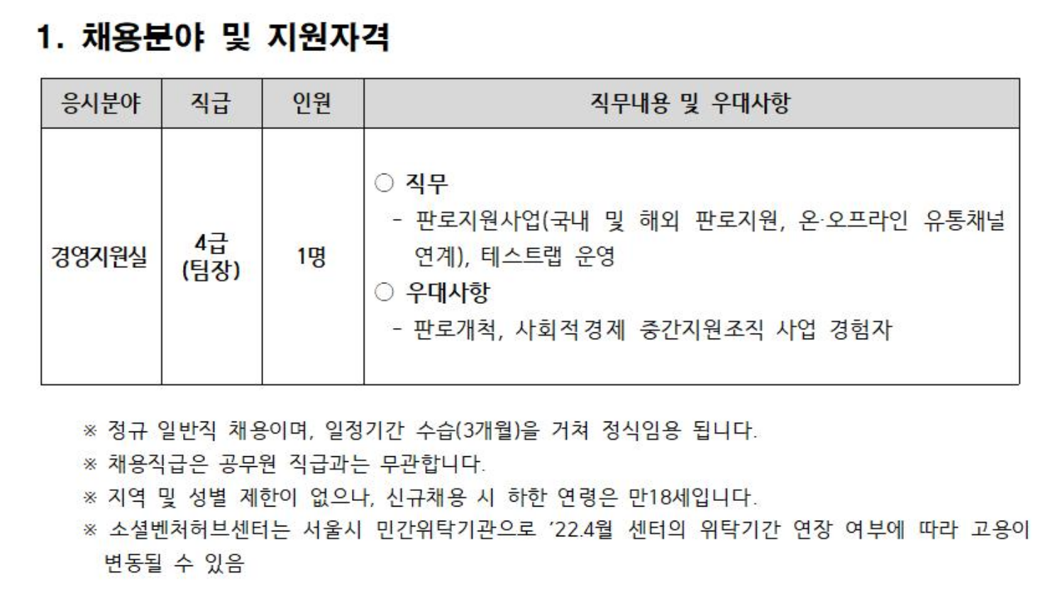 서울시에서 운영중인 '소셜벤처허브센터'에서 2021년 직원을 경영지원실 4급 팀장 채용을 진행하고 있습니다.