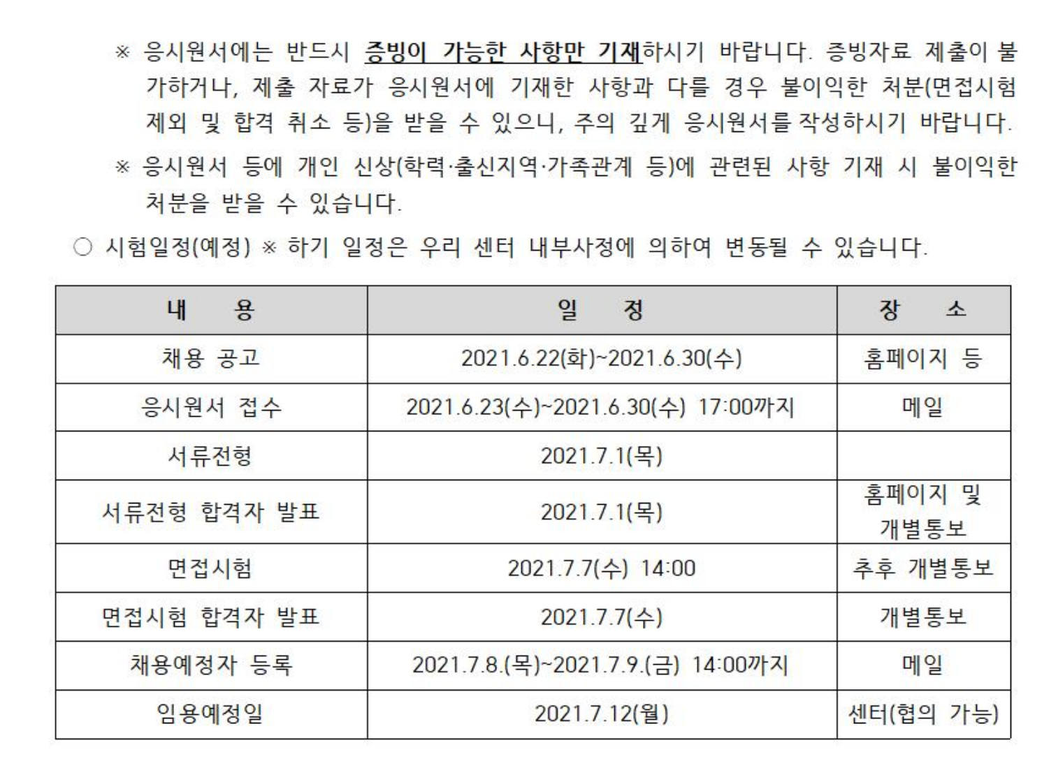 면접 합격자 발표는 7월 17일이고 임용예정일은 7월 12일이나 협의가 가능한 부분으로 되어 있습니다.