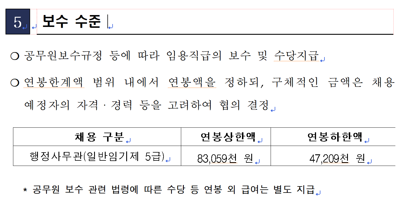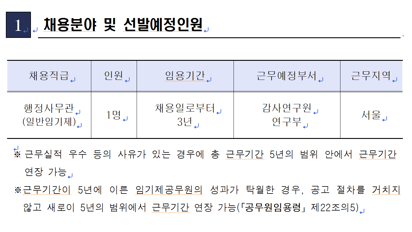 채용직급은 행정사무관(일반임기제)이며 인원은 1명 근무기간은 3년이지만 최대 5년 범위 안에서 연장이 가능하고, 5년이 된 경우라도 성과에 따라 새로 5년이 연장 가능하다고 합니다.