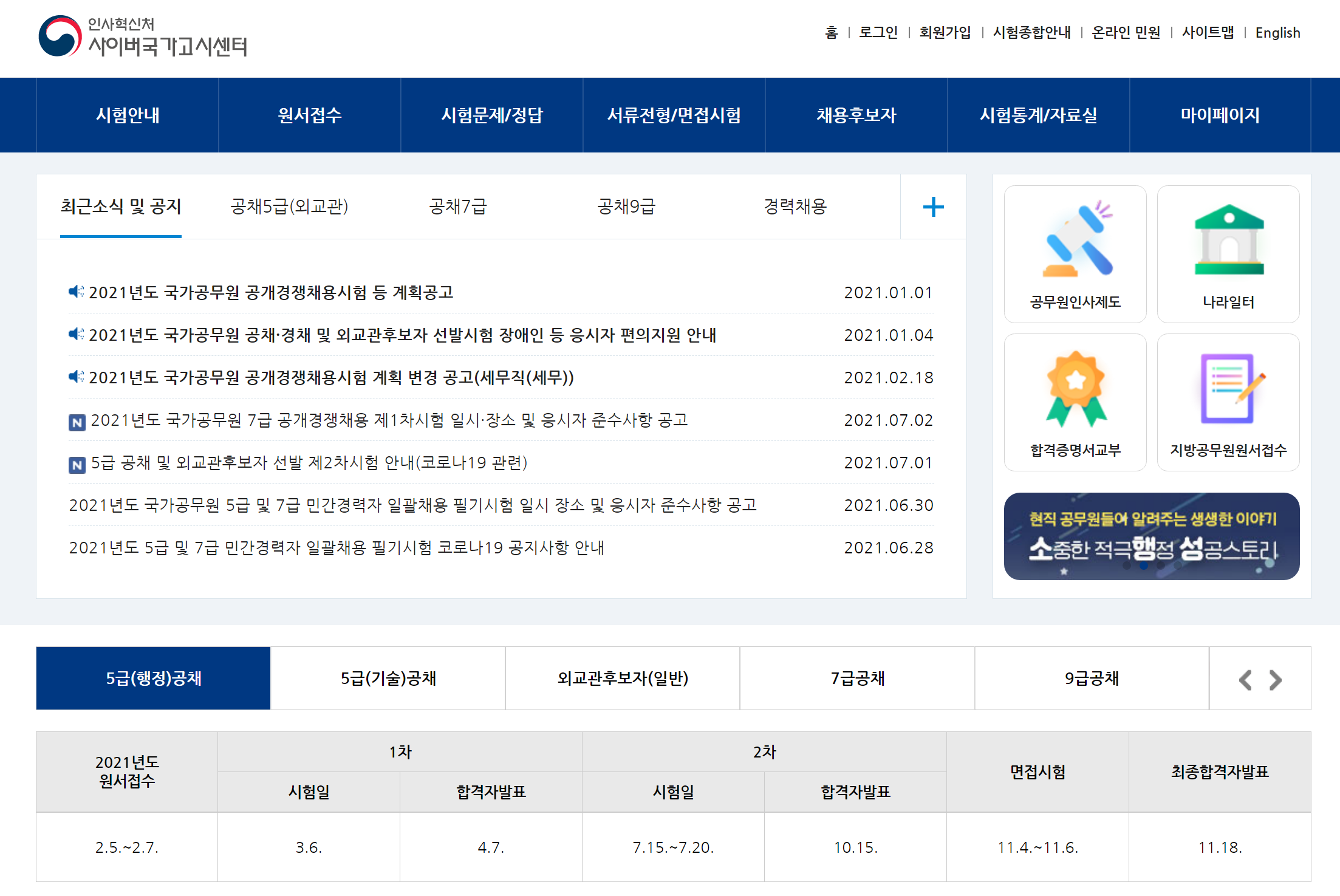 채용 시험에 대한 가장 최근의 소식에서 부터, 5급, 공채7급, 공채9급 채용 정보를 모두 확인 할 수 있습니다.